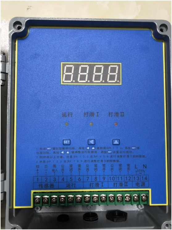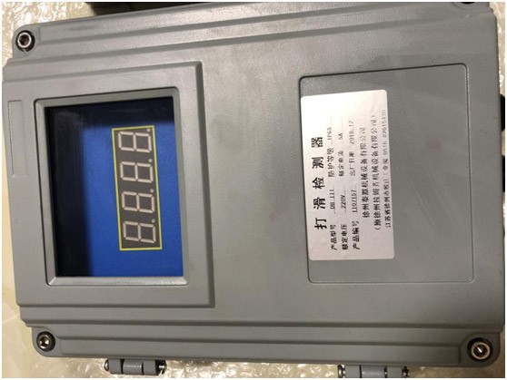 打滑检测器工作时,通过胶带带动触轮,使触轮反应出胶带的实际带速,触轮带动检测器内传动轴,使产品内部继电器工作,继电器工作主要是由轮片切割光电信号,由内设固定数值与实际值产生对比数值从而产生通断信号,完成检测带速工作,如果胶带速度与主滚筒速度不同步并下降到正常带速的20-30%时,接点通断信号发生变化,重新输出一组信号给控制室,警示工作人员胶带已处于严重打滑状态。