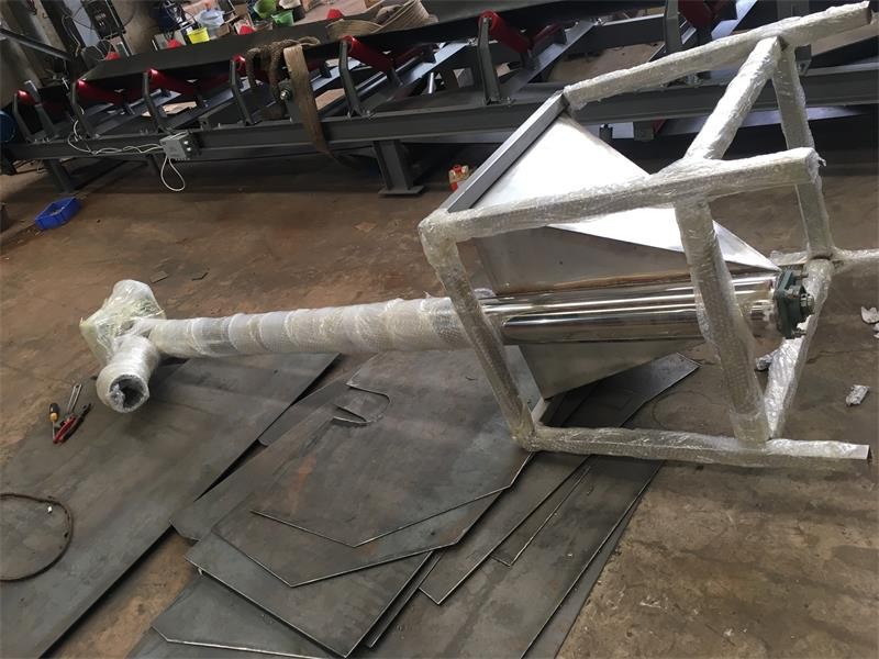 (2)加料与卸料装置:螺旋给料机的加卸料装置有多种形式,以适应不同加卸料位置的要求。常见的加料方式有:物料直接落在螺旋叶片上进行加料,或以星形加料器加料,这种加料能够调节进入螺旋给料机的物料量。一般卸料是从机槽底部开卸料口,有时可沿机长方向开设数个卸料口,以适应多点给料需要。
